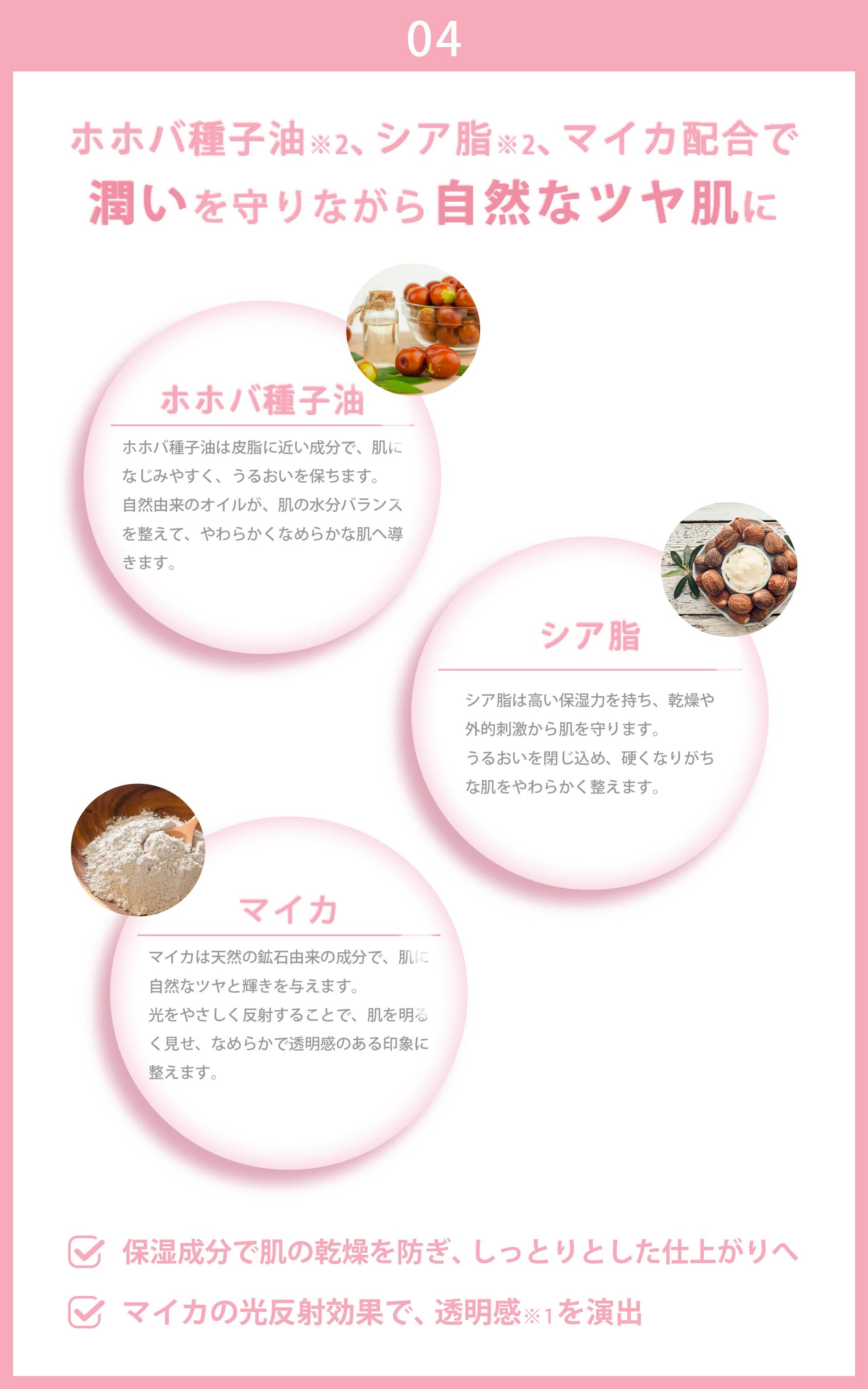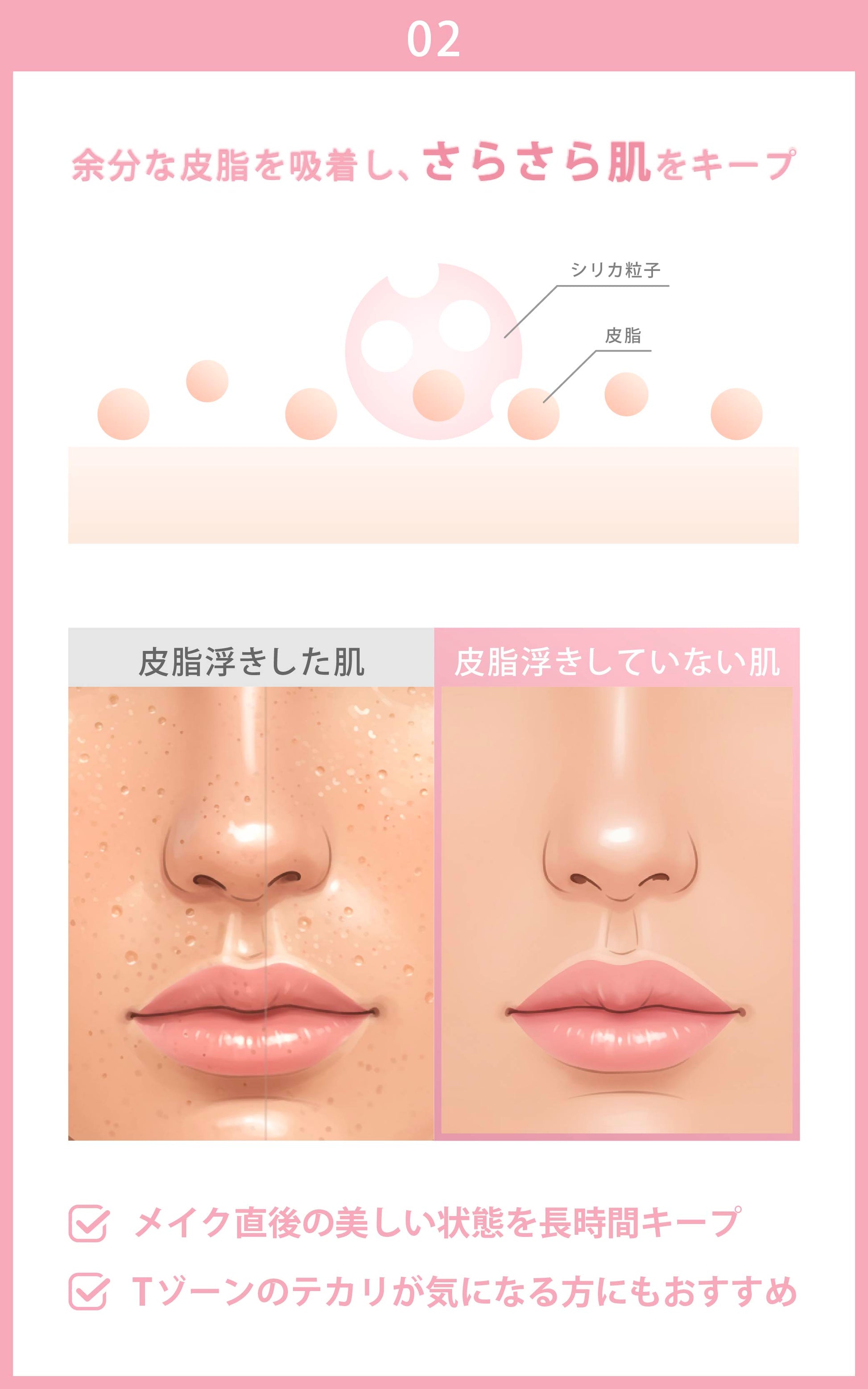 ・肌の凹凸をなめらかに整え、キメ細かく均一な仕上がりを実現します。さらに、シリカが余分な皮脂を吸着し、テカリを防ぎながら長時間さらさらな状態をキープ。
