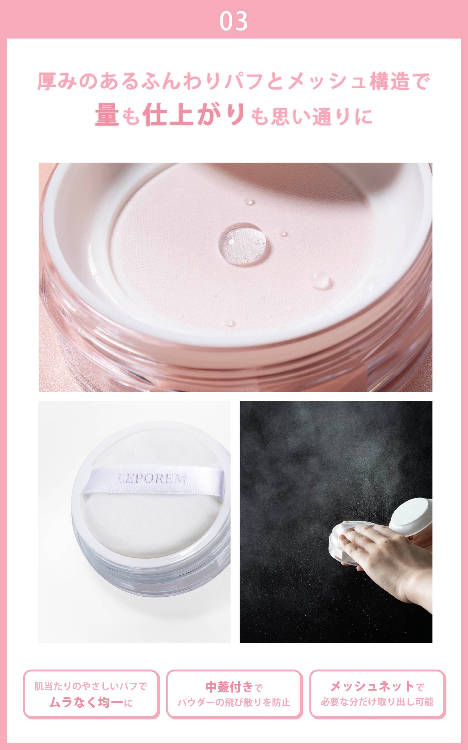 ・ふんわりとしたソフトフォーカス効果で、粉っぽさを感じさせず、素肌のような自然な仕上がりを叶えます。