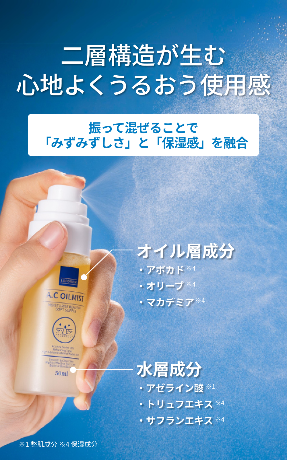 ・オイル層とウォーター層をバランス良く組み合わせたことで、肌にうるおいとツヤをもたらす多機能ミストです。