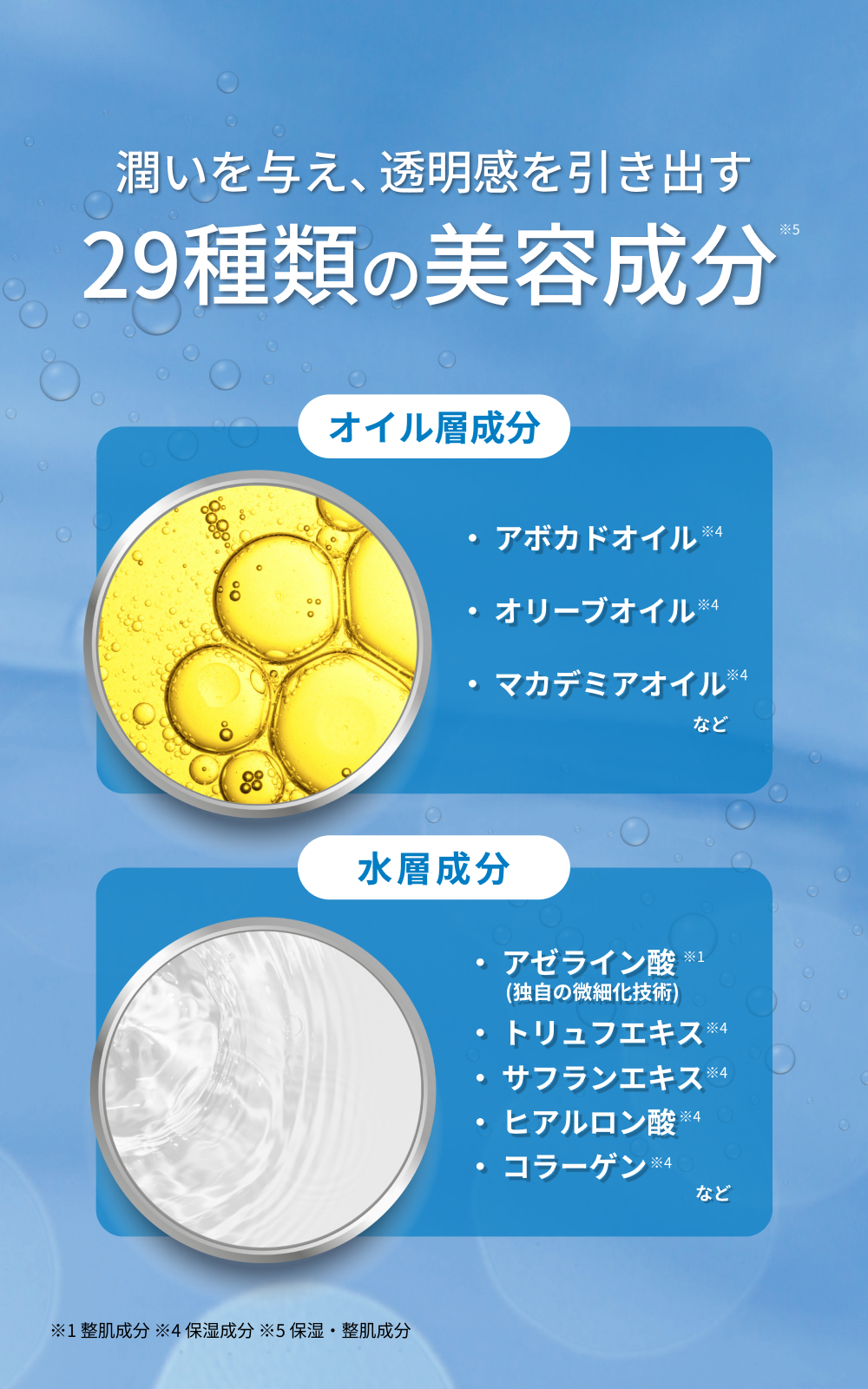 ・オリーブ殻油やアボカド油など多種のオイル成分が肌を包み込み、しっとりした潤い感を保ちながら、美容液をまとったような使い心地を楽しめます。